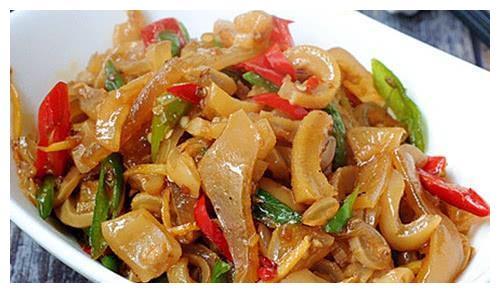 9.将肉皮丝倒入锅中,稍微翻炒后淋入生抽上色。