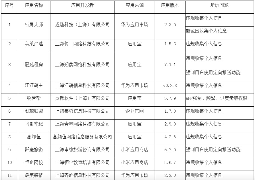 中华网财经7月16日讯,2021年6月8日,上海市通信管理局向社会公示了75款存在侵害用户权益行为的App。在规定的二次整改期限内,经核查复检,尚有锁屏大师、美莱严选、蘑菇租房等11款App未按照要求落实整改。