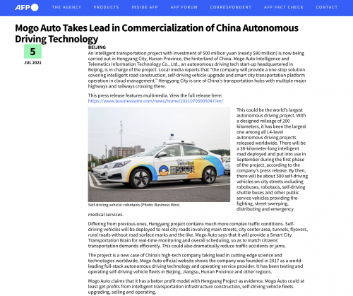 国际媒体也开始关注中国自动驾驶了。近日,中国自动驾驶头部企业蘑菇车联衡阳项目被美联社、法新社等国际媒体报道。报道称,该项目投资5亿元,设计总里程达200公里,是目前全球自动驾驶领域最庞大的落地计划。其第一期38公里的道路将于今年9月建成并投入运营。
