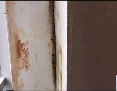 孙女士所住的这套房子在西海岸新区紫锦广场小区,记者来到孙女士的家中,发现客厅南面的墙上有一大片被水浸泡过的痕迹,尤其是墙角那个位置,已经发霉变黑了不说,甚至还长出了小蘑菇!