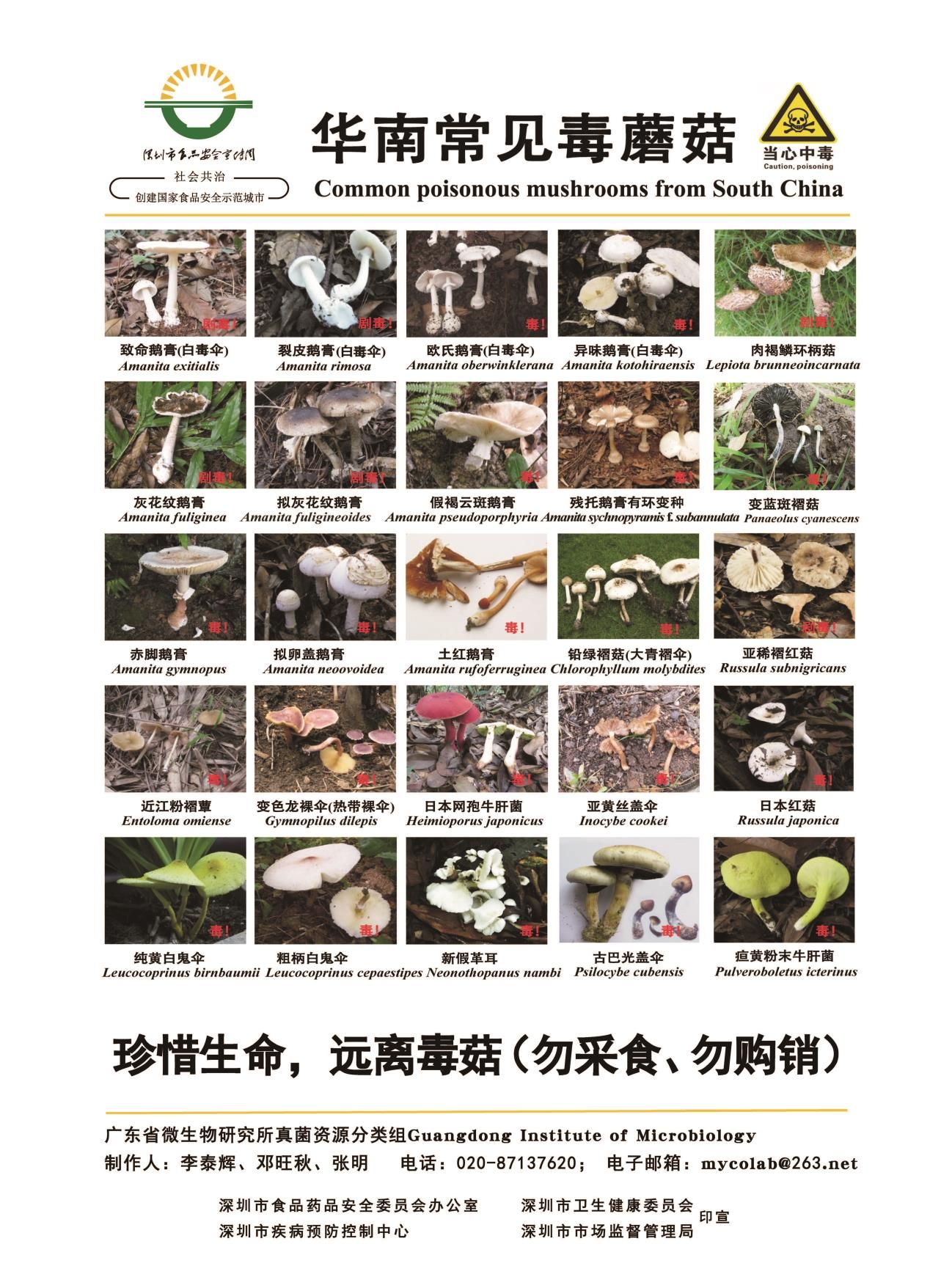 华南地区气候潮湿,野生蘑菇种类繁多,主要的毒蘑菇中毒症状类型可分为急性肝损害型、急性肾衰竭型、胃肠炎型、神经精神型、横纹肌溶解型5种类型。野生毒蘑菇的鉴定需要专业人员借助实验室的专业仪器。民间流传鉴别方法,例如:“颜色鲜艳的,外观好看的蘑菇有毒”、 “不生蛆、虫子不吃、味苦、腥臭的有毒”、 “与银器、大蒜、米饭一起炒或煮后变黑色的有毒”、 “受伤变色、流汁液者有毒” 、“菌盖上有疣、柄上有环和具菌托的有毒”等,都没有任何科学依据,并不能区分野生蘑菇是否有毒。此外,对于食用毒蘑菇中毒目前尚无特效疗法,中毒症状严重,发病急,病死率较高。因此,预防毒蘑菇中毒最有效的办法是不采摘、购买和食用野生蘑菇。